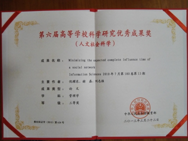 成果概况:该成果获得教育部第六届高等学校科学研究优秀成果奖(人文社会科学)三等奖(论文奖)。此论文是社会网络影响扩散理论中的一项重要成果。此论文研究了社会网络中的优势影响的扩散机制与扩散优化问题,创新性地提出了递增机会模型,给出了递增机会模型的数学性质。此论文提出了社会网络期望完全影响时间最小化问题,建立了该问题的决策模型,设计了基于贪婪算法的启发式算法框架,并实施了一系列实验以验证算法的有效性和稳定性。