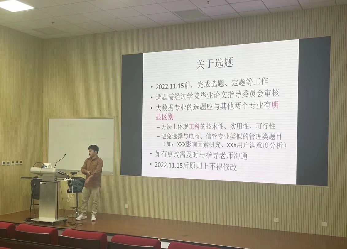 信息管理与信息系统系顾睿老师向信管系的同学们讲解了毕业论文/设计的重要性,要特别注意论文的创新性、可行性。顾老师指出:“做论文要积极主动,多思考、多阅读、多与导师交流,选题不要过于宏观和泛化,要相对微观且具体,要以严谨认真的态度对待毕业论文。”
