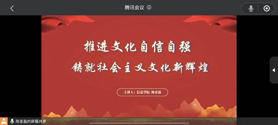 2023年5月11日,为学习贯彻党的二十大中“文化自信”的重要精神,深入推进主题教育支部书记讲党课活动的开展,皇冠足球网 研究生一支部组织了以“推进文化自信自强,铸就社会主义文化新辉煌”为主题的线上党课教育活动。党课主讲人为研究生一支部书记陈家盈。