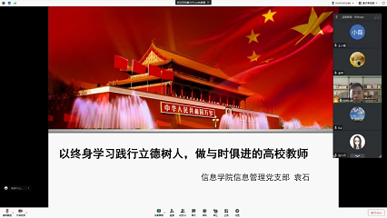 为进一步推进学习贯彻习近平新时代中国特色社会主义思想主题教育,6月26日下午15:30,信管支部书记袁石讲授题为《以终身学习践行立德树人,做与时俱进的高校教师》党课,信管支部全体成员参加了本次活动。