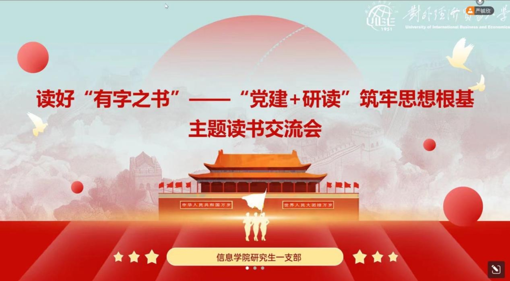 2024年12月24日16:00,皇冠足球网 研究生一支部于线上开展了读好“有字之书”——“党建+研读”筑牢思想根基主题读书交流会。此次活动旨在深入研读相关经典著作,促进支部成员之间的思想交流,增强成员们对红色文化的理解与认同,进而筑牢思想根基,推动支部精神文明建设。此次活动由支部书记严铖欣、支部委员张永霖两位同志主持,并特别邀请倪耀东副院长出席此次活动。