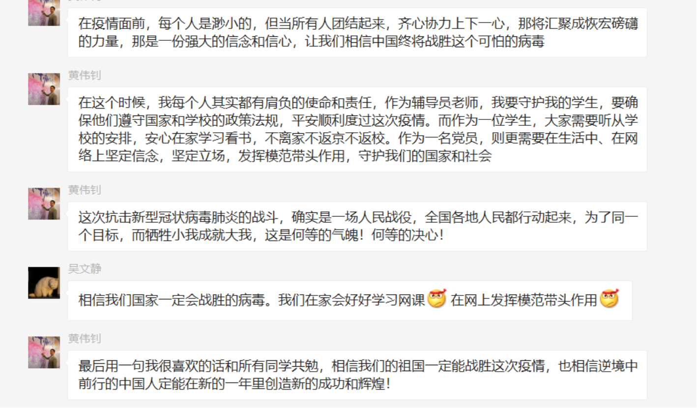 活动的第二个环节,是黄伟钊老师与支部学生就视频内容展开讨论,交流感想。学生们对视频内容都感触颇深,学生党员吴文静发言道:“医护人员冲在最前线,不顾自己的生命安危,为国家为病人。科研人员日夜不顾探究其病理原因、研发新的疫苗,敬意油然而生。相信‘子夜终将近,春日终将来’。”入党积极分子严铖欣认为:“作为入党积极分子,虽然不能像医务工作者一样奔赴一线,但我们要学习他们的模范先锋精神,做好学生的本职,做好自我隔离与防范就是对国家最大的贡献。”另一位学生党员楼佳雯说道:“虽然视频充满积极正能量,但我们仍然要对疫情严肃对待,不能松懈,前段时间湖北的相关官员被大量撤职,就是对一些尸位素餐的人的警告,疫情面前,不能有分毫差错。”同学们主动思考,在微信群中积极发言,互相探讨不同的观点,积极与黄伟钊老师交流自身的所感所悟。