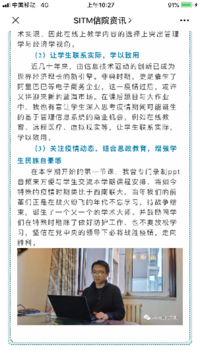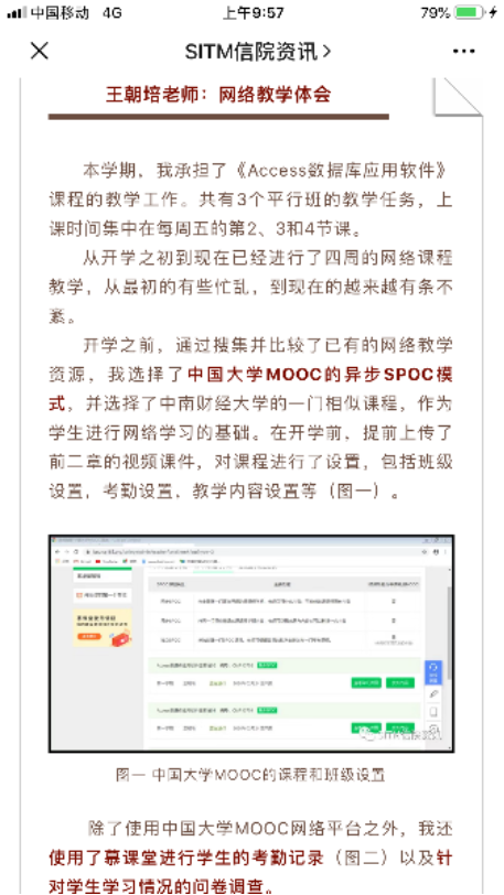 为了维护我校教学秩序正常进行,做到“停课不停教,停课不停学”,学院在接到学校通知后,第一时间成立在线教学组织与管理工作小组,通过微信群向全院30名任课教师传达相关精神,组织任课教师做好网络授课方案,按照教务处要求进行三次网络教学方案摸底工作。鼓励教师采用以校内外MOOC资源网上授课、录播为主,直播为辅的授课方式,并结合学生自学、网络研讨等个性化、多样化的教学方案开展网络教学工作。经过多次动员,我院使用校内外MOOC资源网上授课课程达到78.8%,录播与直播相结合授课课程21.2%,无仅直播方式授课课程。在开课前,建立各课堂微信交流学习群,为教师与学生搭建沟通、讨论平台。任课教师对微信群内学生进行一一核对,对于未进入课程微信群的学生上报学院,我院联系其他兄弟学院联动督促学生进入课程微信群,切实做到“一个也不能少”。为了网络教学工作顺利进行,学院教学办公室建立学院网络教学工作群,工作群中包含本学期30名任课教师。教学办公室及时在网络教学工作群中发布学校通知与工作安排。每日7:00-24:00实时回复教师对于网络教学安排的问题,做到“有问必答”。同时,学院教学办公室还与各年级大班长建立沟通群,实时了解、解决学生在网络学习过程中以及日常教学事务中遇到的问题与困难,切实保证网络教学工作顺利开展。为及时总结网络教学经验,学院在微信公众号“信院资讯”中推出“皇冠足球网 教师网络教学经验分享”专栏,各位化身“主播”的教师积极分享网络教学经验。疫情期间,毕业审核、毕业论文、成绩异议以及其他大部分日常教学工作都转为线上办理,学院教学办公室通过网络等远程方式,完成专业评估材料准备、毕业论文中期检查、学生学分替换等常规教学相关工作,及时快速地反馈教务处和研究生院。目前,学院网络教学工作平稳有序。