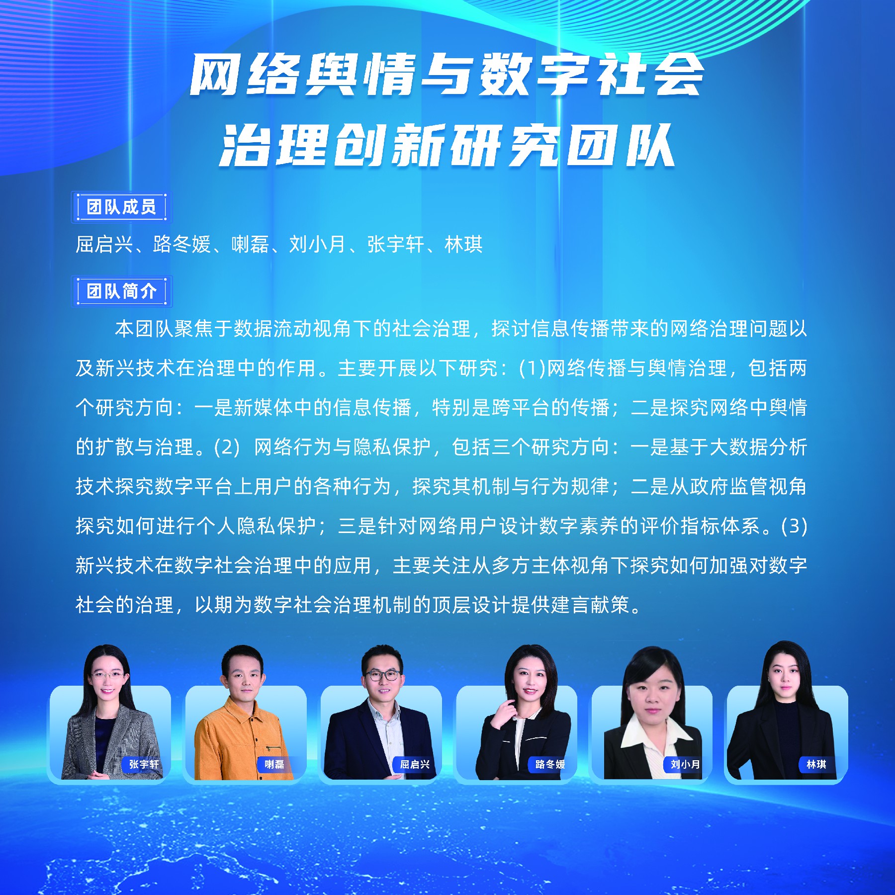 本团队聚焦于数据流动视角下的社会治理,探讨信息传播带来的网络治理问题以及新兴技术在治理中的作用。主要开展以下研究:(1)网络传播与舆情治理,包括两个研究方向:一是新媒体中的信息传播,特别是跨平台的传播;二是探究网络中舆情的扩散与治理。(2) 网络行为与隐私保护,包括三个研究方向:一是基于大数据分析技术探究数字平台上用户的各种行为,探究其机制与行为规律;二是从政府监管视角探究如何进行个人隐私保护;三是针对网络用户设计数字素养的评价指标体系。(3) 新兴技术在数字社会治理中的应用,主要关注从多方主体视角下探究如何加强对数字社会的治理,以期为数字社会治理机制的顶层设计提供建言献策。