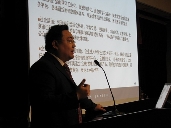 最后发表演讲的是任晓明先生。作为参与奥运会多语言方面技术运行开发的一员,他向我们分析了奥运门票运营平台的运作原理及不足。他把奥运门票比做与人们生活息息相关的交通一卡通来介绍奥运会实施电子门票这种信息化策略的意义。他认为,这将影响到未来消费文化理念,并指出带有磁条的银行卡和火车票也会促使市场逐渐向使用芯片技术方向靠拢,尽管这项应用现在还很保守。这一切都将推动制造业的发展。