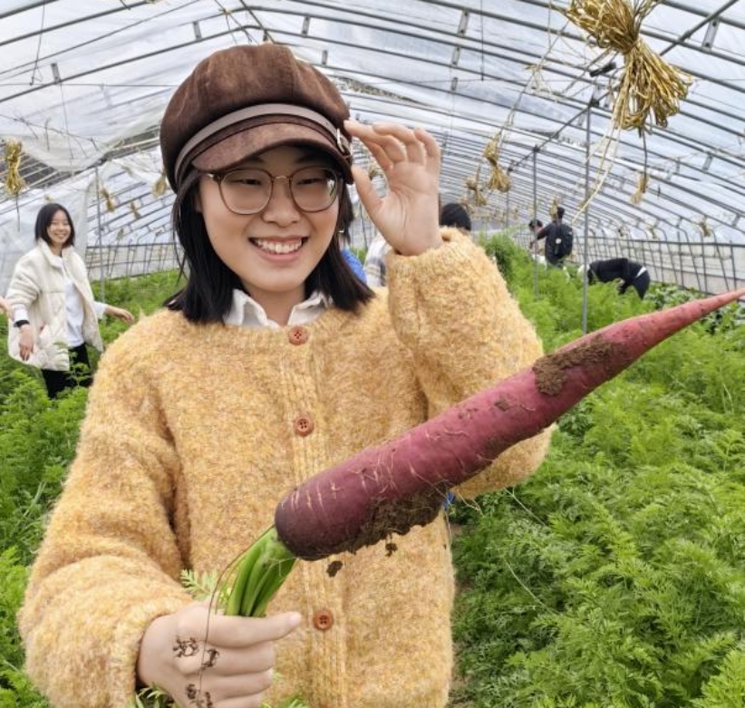移步胡萝卜种植区,工作人员以实物对比的方式讲解品种差异:“紫胡萝卜富含花青素,黄胡萝卜甜度更高,橙色品种则产量稳定”,同学们边听边实践,蹲身握住萝卜缨轻轻摇动后垂直拔起,带着新鲜泥土的胡萝卜随即破土而出。劳动之后,大家品尝现采的胡萝卜,清甜爽脆的口感获得了大家的一致好评。