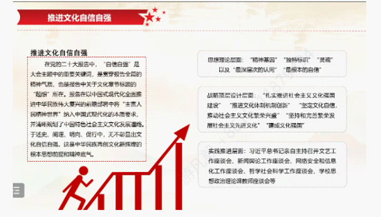 霍怡情同志在这一部分为大家分析讲述了坚定文化自信的原因。首先,她指出文化自信在“四个自信”中的基础作用。坚定中国特色社会主义道路自信、理论自信、制度自信,说到底是要坚定文化自信。文化自信是道路自信、理论自信和制度自信的基石,只有建立在文化自信的基础上,这三者才更加稳固。随后,她重点解说了文化自信的来源,无论是新民主主义革命时期还是新时代我们要进行的社会主义现代化建设,要想实现伟大中国梦,都离不开文化所激发的精神力量。 最后,霍怡情同志呼吁我们必须始终坚定文化自信,不断激发全民族文化创造活力,更好的构筑中国精神、中国价值和中国力量。