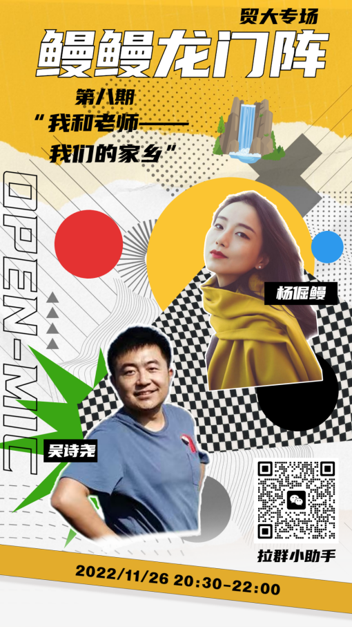 时光飞快,九期《鳗鳗龙门阵》已缓缓落下帷幕,无论是趣意盎然的经历分享,又或是精彩绝伦的才艺展示,都给同学们留下了深刻的印象。嘉宾们与同学们精彩有趣的互动聊天,不仅帮助同学们在疫情期间舒缓了焦虑的心情,排解了负面的情绪,更拉近了师生间的距离,同时还让同学们在聊天的过程中拓宽视野、引发思考,成为了疫情期间温暖贸大的一束束冬日暖阳。我们坚信,在这样充满人文关怀和温情呵护的惠园里,我们终将战胜疫情,迎来灿烂美好的明天!
