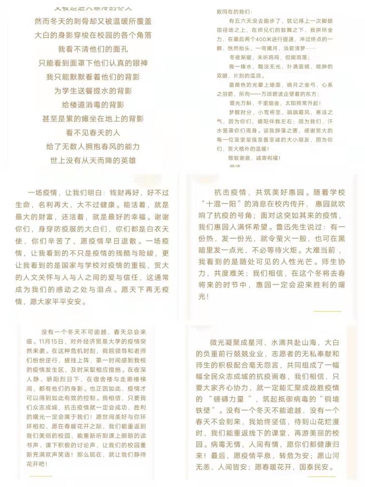 同学们积极响应本次活动,吐露心声。祝福语中既有对抗疫一线人员的感谢与关怀,也有对贸大能成功抗疫的信任与支持,更有对疫情结束后的生活向往......这些祝福语字字饱含真情实感,不仅温暖了白衣天使的心,也感动了贸大的每一个人。