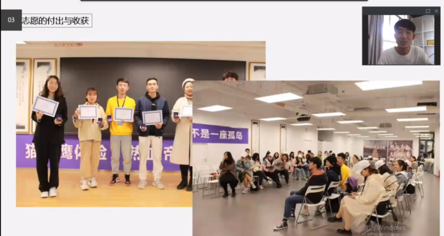 接着是来自皇冠足球网 16级的付瑞鑫同学进行分享,他以一段有趣的自我介绍进行开场,他的分享主题为“做自己的主人,做他人的伙伴”,从志愿经历、获取志愿渠道、志愿的付出与收获以及一些建议四个部分展开。他的志愿经历丰富,总时长达579小时,其中支教占据很大比例。他向大家分享多个志愿平台,从校内志愿到社会公益组织,类型繁多。谈及付出时,他说虽然进行志愿服务需要从其他事情上匀出时间和经历,但从其中获得的收获让他感到非常满足。他建议同学们做志愿服务时,应该想到“我想做的是那一件事,顺便获得一点其他收获”。在最后的提问环节,他告诉大家支教的环境已经得到很大的改善,同时在支教期间,孩子们的很多行为都令他十分感动。
