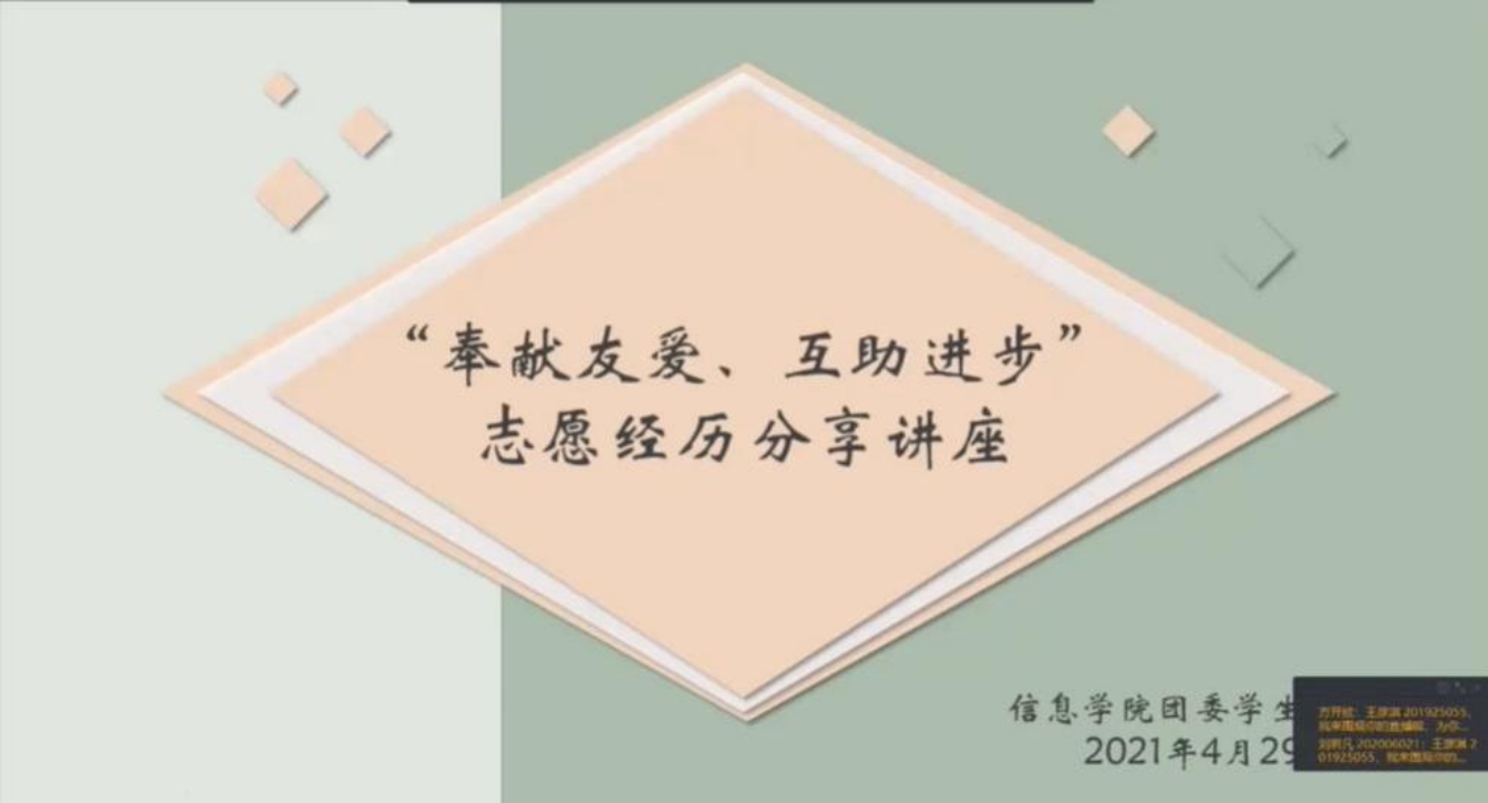 2021年4月29日15:30,皇冠足球网 志愿经历分享讲座在线上顺利举行。讲座伊始,主持人向大家播放了一段由皇冠足球网 志愿服务中心出品的视频作为整场讲座的引入。视频充分展现了志愿服务的意义以及皇冠足球网 志愿服务的成果,鼓励大家将志愿服务活动融入日常生活,让乐于助人成为我们生活的主旋律。