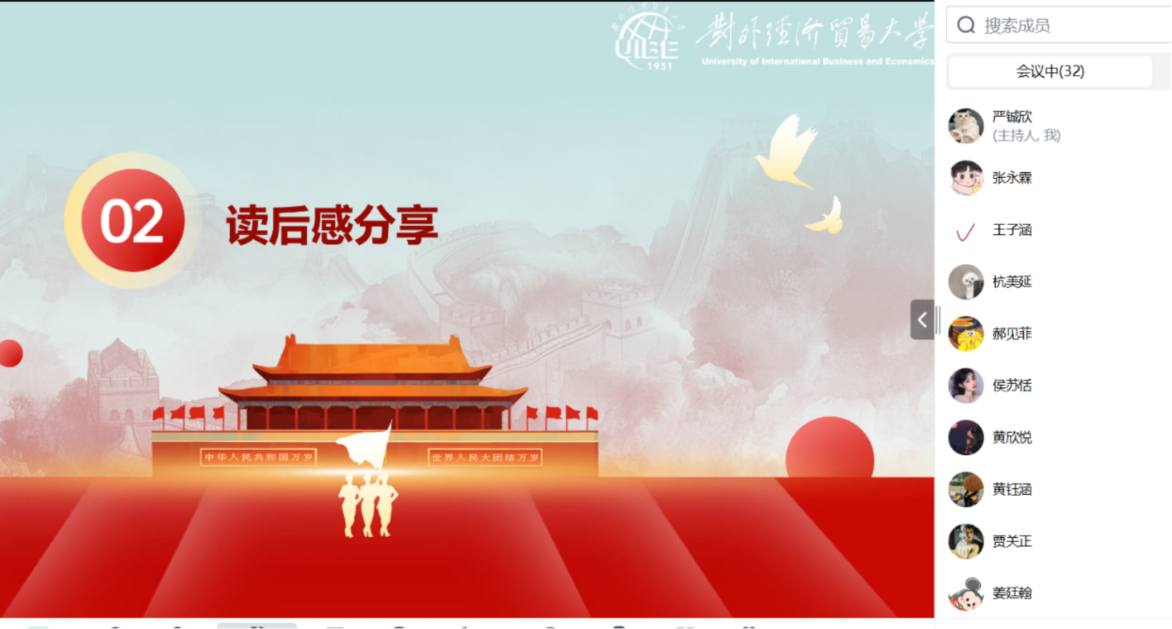 2024年12月24日16:00,皇冠足球网 研究生一支部于线上开展了读好“有字之书”——“党建+研读”筑牢思想根基主题读书交流会。此次活动旨在深入研读相关经典著作,促进支部成员之间的思想交流,增强成员们对红色文化的理解与认同,进而筑牢思想根基,推动支部精神文明建设。此次活动由支部书记严铖欣、支部委员张永霖两位同志主持,并特别邀请倪耀东副院长出席此次活动