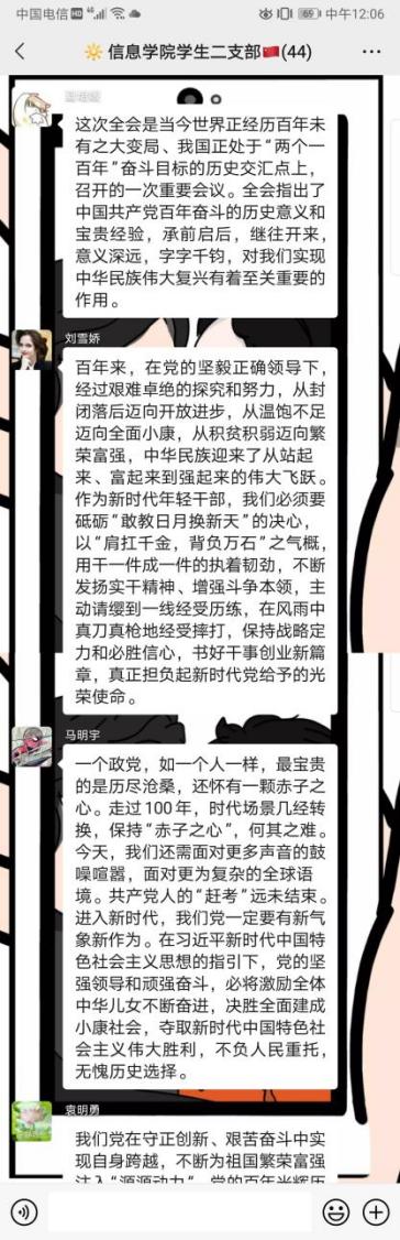 皇冠足球网 本科生二支部在11月18日晚以线上分享交流的形式,对十九届六中全会精神进行了学习。活动由支部副书记陈家盈同志主持,二支部所有成员参与。二支部成员观看了十九届六中全会的发布会,感悟会议精神,充分交流各自的感想与心得,大家纷纷表示作为年轻党员在深切感受党史中“苦难和辉煌”“曲折和胜利”“付出和收获”的心路历程后,要始终保持谦虚谨慎、戒骄戒躁、锐意进取的心态,踏踏实实做第二个百年奋斗目标的“接棒者”,在新时代奋进的新征程中永葆革命精神和斗争精神,越是艰难越向前,不断开拓进取。会议取得了圆满的效果。