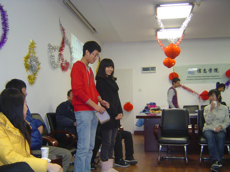 信息管理系2010级2班的全体同学准时在博学1417集结,与早已等候在此的兼职班主任郝素敏老师共同庆祝2011年元旦的到来。 整个会场张灯结彩,喜气洋洋。桌子上摆放着郝素敏老师自掏腰包为大家准备的各种零食、饮料和水果。整个会场充满了欢乐、和谐的气氛。
