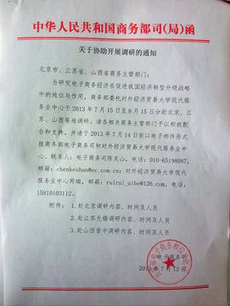 2013年5月至6月,经过严格的项目评审,共有30余名2011级和2012级学生组队申报成功。2013年6至8月,在商务部电子商务司的指导下、各地商务局的支持下,各调研团队奔赴北京、山西、江苏等地,就电子商务发展政策环境与机制建设要求、电子商务促进就业发展情况、电子商务促进产业协同创新、电子商务促进内需发展的方式及路径、电子商务推动中国经济转型升级情况、电子商务促进中小企业发展情况等6个主题,深入政府、企业进行了实地调研,取得了良好成效,推广了贸大品牌,传播了信院正能量,受到了当地政府和企业的一致好评。