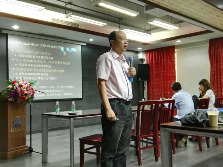 王健教授为学生们讲授了一场题为“普惠贸易趋势与跨境电子商务发展”的讲座。王讲授采用中英文交替的形式,用幽默风趣的语言和形象生动的案例,给学生们讲解了普惠贸易的形成,电商在中国发展的条件和优势以及全球贸易的转型和发展趋势。学生们对讲座内容表现出极大的兴趣,与王教授进行了充分的交流互动,纷纷表示受益良多。