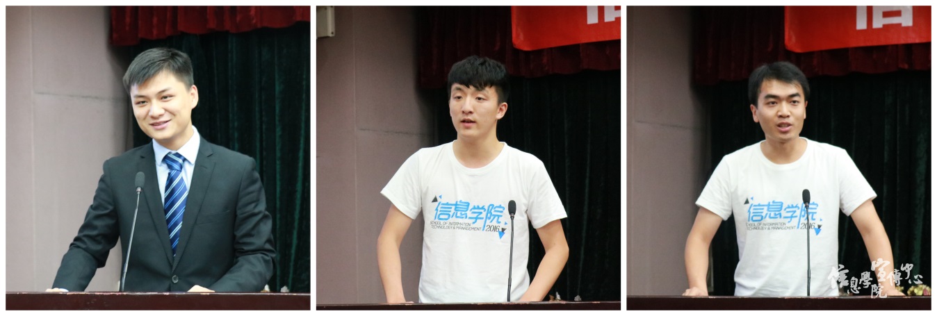 随后,2014级本科生李子康同学作为在校生代表发言。他希望学弟学妹们能保持好奇心和求知欲,做一个自信、快乐、有责任感的信院人。最后,本科生新生代表李禾田同学、研究生新生代表朱璇同学接连上台发言,表达了新生初入惠园的兴奋心情以及对未来学习生活的信心。