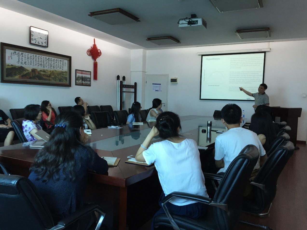 师生进行了学术交流,并做了题为《When "I" Becomes "You": How and Why Perspective Taking Shapes Helpfulness Perceptions of Online Reviews》的学术讲座。多名教师、博士生、硕士生们参加了本次讲座,电子商务系主任程絮森副教授主持了本次讲座。