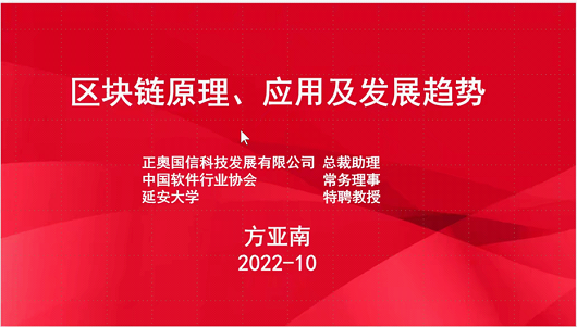 2022年11月6日,皇冠足球网 举办第二场数字经济大讲堂活动。讲座由延安大学特聘教授,正奥国信科技发展(天津)有限公司副总裁方亚南博士主讲,题为《区块链原理、应用及发展趋势》。讲座由电子商务系系主任屈启兴副教授主持,皇冠足球网 师生在线参与了此次活动。