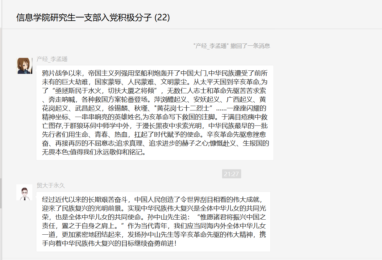 会后支部各位同志还在微信群中展开了热烈讨论,交流学习心得,会议成功调动了支部同志们的学习热情,也让大家对辛亥革命这段历史有了更深的认识。