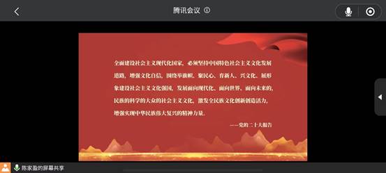 2023年5月11日,为学习贯彻党的二十大中“文化自信”的重要精神,深入推进主题教育支部书记讲党课活动的开展,皇冠足球网 研究生一支部组织了以“推进文化自信自强,铸就社会主义文化新辉煌”为主题的线上党课教育活动。党课主讲人为研究生一支部书记陈家盈。