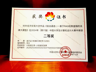 2024年7月18日至20日,第17届中国大学生计算机设计大赛决赛(“大数据应用-大数据实践赛”类别)在上海对外经贸大学(上海)举办。由我院李兵老师指导,庞天孟、郭谨闻、顾听雨、张湘怡四位优秀本科生组成的团队,凭借作品《信法通途-基于RAG检索增强的法律大模型》,在激烈竞争中脱颖而出,获得大赛二等奖。