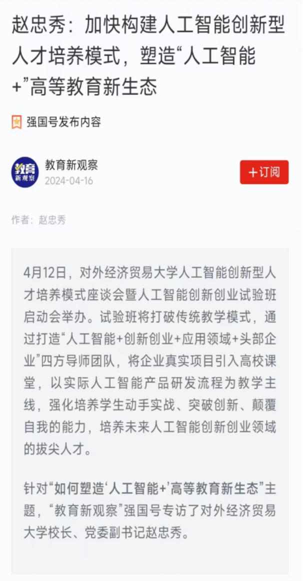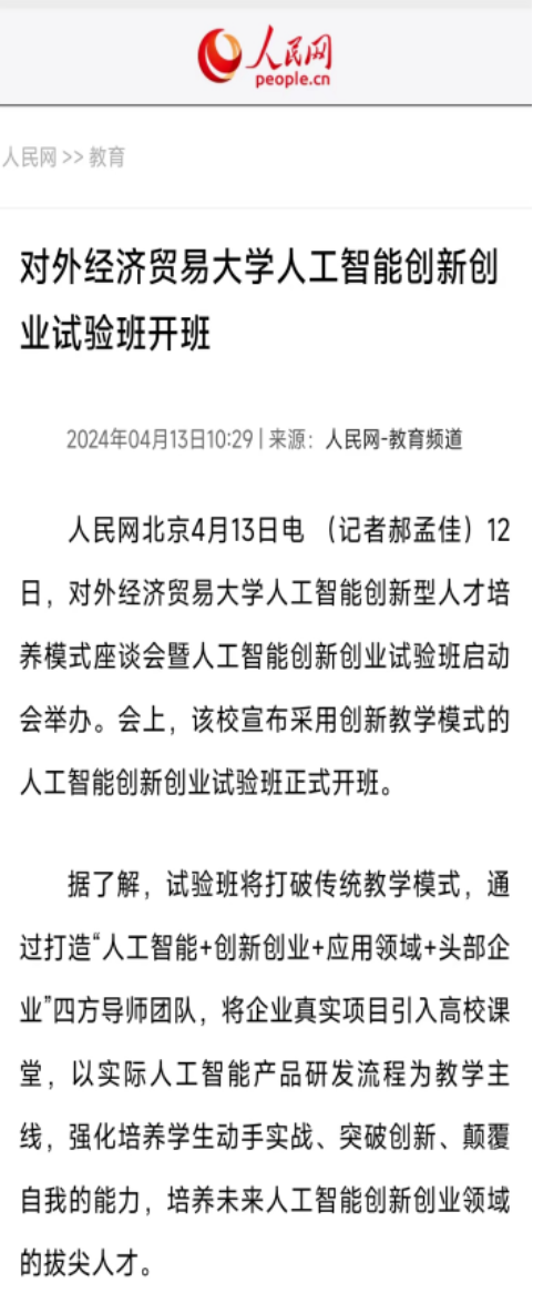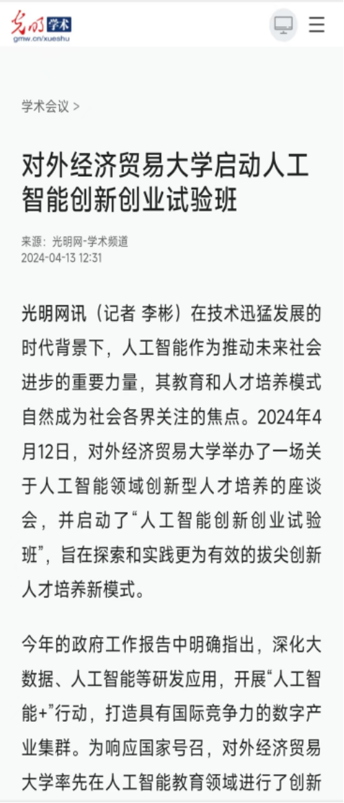 通过试验班的培养,学生不仅能在国际标准化竞赛中开拓创新,还能够研发出实际产品,接受市场检验,并获得创业投资。人工智能创新创业试验班践行教育部部长怀进鹏提出的“在实践中培养拔尖创新人才”,为培养有智能素养、有创业思维、有管理能力的拔尖人才打造“贸大模式”,并得到了人民网、光明网、学习强国、中国教育报等多家媒体报道,在全国高校中取得了热烈反响。