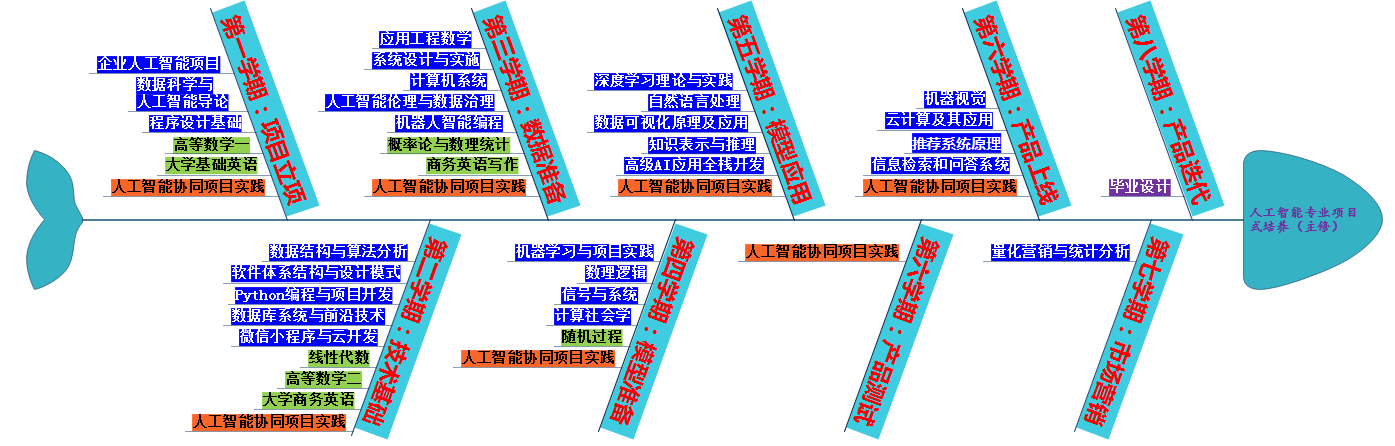 人工智能创新创业试验班推行一个中国信创产品为基础、二种学科深度融合、“本-硕-博”三层培养覆盖、和四方导师组团的“一二三四架构”。在课程设置方面,试验班采用项目制培养模式,依托企业实际需求,以实际人工智能项目开发过程为教学主线,专业课程以项目式实践教学为主,围绕项目立项、技术基础、数据准备、模型准备、模型应用、产品测试、产品上线、市场营销、产品迭代九个主要环节设计课程,最终完成真实AI项目的开发与实践,以培养能解决教育、金融、保险、健康等各领域应用场景中复杂问题的“人工智能+”交叉复合型人才及“未来行业领袖人才”。