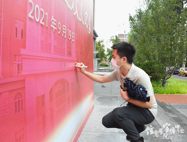 象征“猫大”的卡通立牌(由皇冠足球网 2021届校友王安琪同学设计)