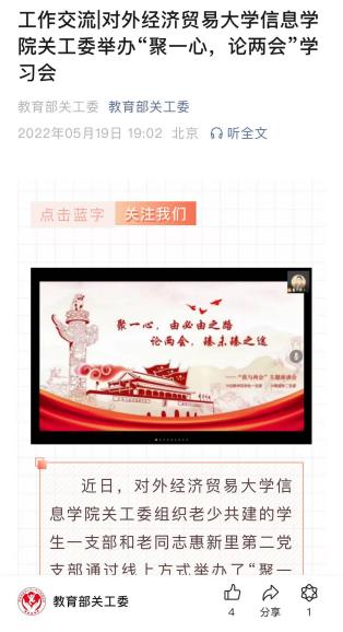 此次红色“1+1”共建活动的成功开展,得到了共建支部的支持和认可,惠民一中公众号和学校公众号都对“惠”泽心田红色“1+1”共建活动进行了报道。此外,支部共建活动的亮点和成果更是获得了北京市和教育部关工委公众号的多次报道。这些荣誉不仅是对皇冠足球网 学生一支部工作的肯定,更是对新时代青年责任与担当的赞誉。