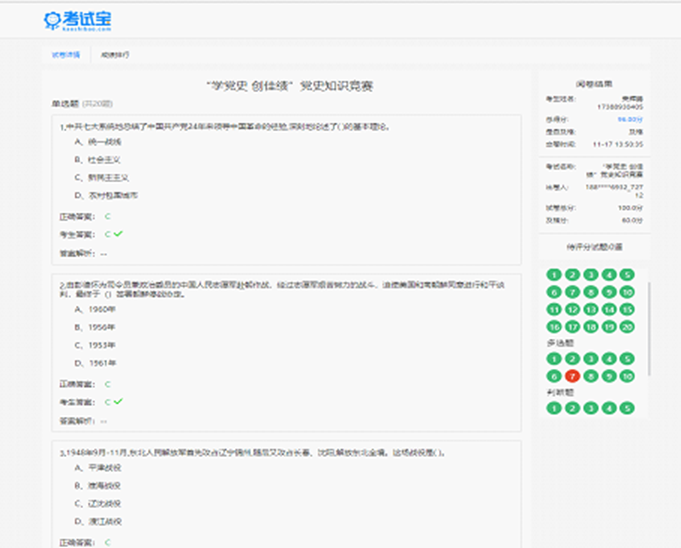 本次活动由行政党支部支委会筹备,在比赛前期共同完成了活动策划、试卷题目设计、活动宣传等工作。支部党员积极响应和支持知识竞赛活动,比赛当天,支部党员使用“问卷星”参与竞赛,答题认真,快速。最终,8名党员参与本次竞赛,刘建军老师、王安娜老师、刘赫然老师和张延红老师分别获得竞赛的前三名,支部成员中6名党员拿到了90分以上的好成绩,活动达到了“以赛促学”的良好学习效果。