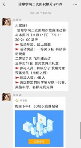 为促进学生学史明理、学史增信、学史崇德、学史力行,并进一步坚定理想信念,树立伟大理想,加强大学生思想政治教育,引导学生党员自觉用党章和党规党纪规范自己的言行,皇冠足球网 学生二支部于11月17日13:30举办了以“学党史守初心 勇做时代新人”为主题的党史知识竞赛,活动形式为线上答题,鼓励积极分子和学生党员积极参与。