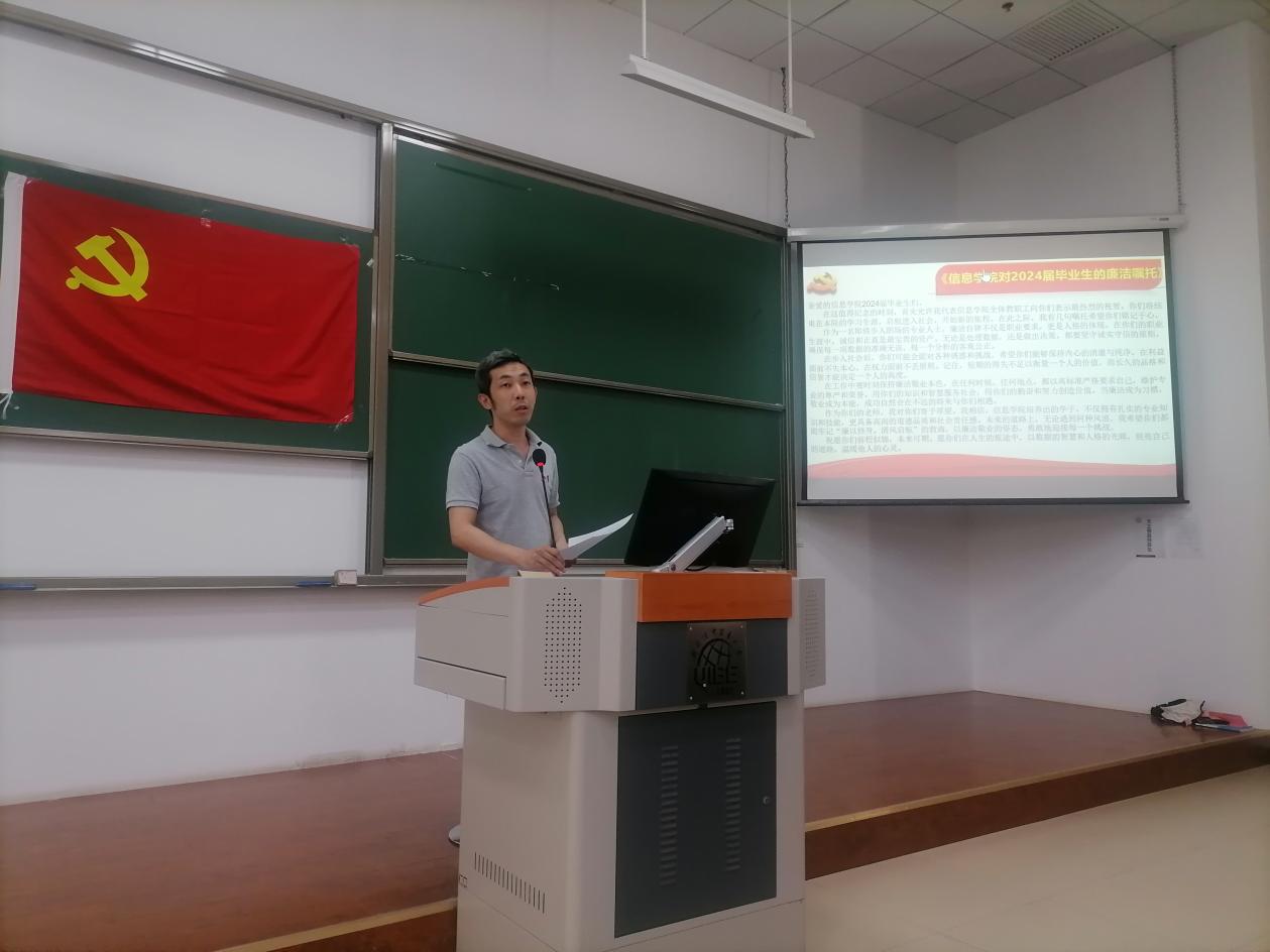 接着,皇冠足球网 副院长倪耀东也向在场的学生发出了语重心长的《皇冠足球网 对2024届毕业生的廉洁嘱托》。他强调了作为未来数字经济产业精英所应承担的职责,同时提醒学生们在职业道路上要诚信守信,维护数据的准确无误,并在任何时候保持高标准严格要求自己。
