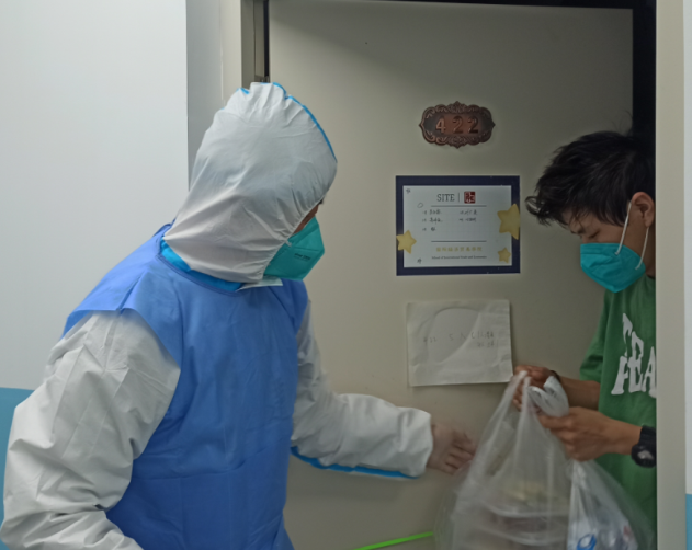 在汇宾公寓的志愿者王树西老师说,从11月15日第一天出现疫情开始,我就一直在汇宾公寓做志愿者,为隔离人员服务、运送各种物资。被隔离人员非常感恩,对我们的工作非常认可。疫情终将过去,贸大的明天会更加美好。