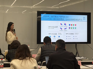 随后,金山办公解决方案专家何思雨就WPS AI产品及其在教育领域的应用案例与党员同志们进行了主题分享。何思雨阐述了金山办公在追求创新的道路上,坚持稳健的发展策略。同时,她向大家展示了金山办公产品从WPS AI 1.0到WPS AI 2.0的发展历程及WPS AI产品在教育领域中智慧助理、辅助分析和知识洞察等能力的应用。