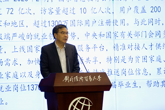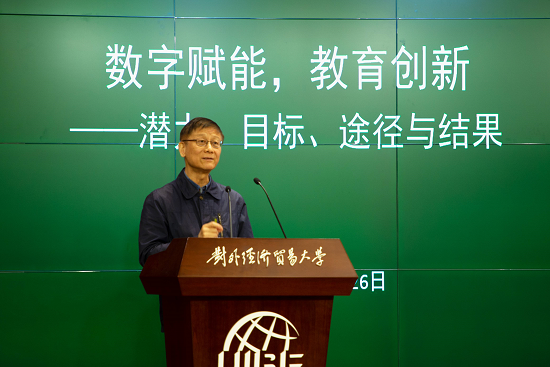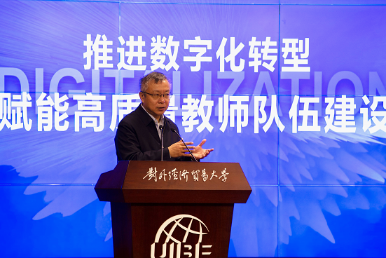 校党委书记黄宝印致论坛欢迎辞,对今天莅临现场、共商教育数字化战略未来的各位嘉宾表示诚挚感谢,他强调发展数字教育、落实教育数字化战略,是国家大势所趋,发展所需,改革所向,是教育工作者应有之志,应有之责,应立之功。教育数字化是新一轮科技革命和产业变革中推动教育发展、赋能教育创新的重要力量和集中体现。近年来,贸大依托大数据和人工智能等建设,持续改革线下教学环境、开展数字讲堂活动,持续推动贸大的教育数字化转型。当前,贸大在国家智慧教育公共服务平台有超过六十门慕课,选课人数超过十万人。未来,学校将进一步发挥优势,为国家教育数字化战略贡献贸大力量。